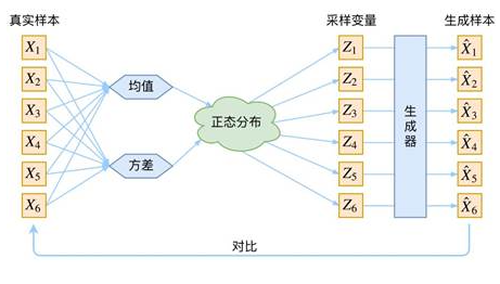 VAE 作为一个生成模型,其基本思路是很容易理解的:把一堆真实样本通过编码器网络变换成一个理想的数据分布,然后这个数据分布再传递给一个解码器网络,得到一堆生成样本,生成样本与真实样本足够接近的话,就训练出了一个自编码器模型。那 VAE(变分自编码器)就是在自编码器模型上做进一步变分处理,使得编码器的输出结果能对应到目标分布的均值和方差,如下图所示: