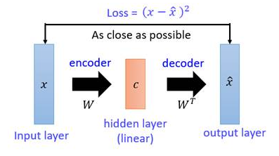 如图,X 本身是一个矩阵,通过一个变换 W 变成了一个低维矩阵 c,因为这一过程是线性的,所以再通过一个 WT变换就能还原出一个x^,现在我们要找到一种变换 W,使得矩阵 X 与能够尽可能地一致,这就是 PCA 做的事情。在 PCA 中找这个变换 W 用到的方法是 SVD(奇异值分解)算法,这是一个纯数学方法,不再细述,因为在 VAE 中不再需要使用 SVD,直接用神经网络代替。
