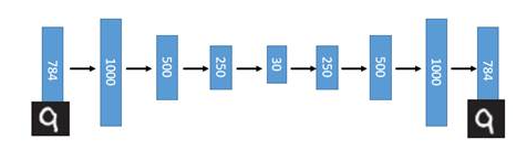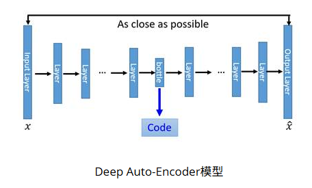 我们会发现 PCA 与我们想要构造的自编码器的相似之处是在于,如果把矩阵 X 视作输入图像,W 视作一个编码器,低维矩阵 c 视作图像的编码,然后WT和x^分别视作解码器和生成图像,PCA 就变成了一个自编码器网络模型的雏形。现在我们需要对这一雏形进行改进。首先一个最明显能改进的地方是用神经网络代替 W 变换和WT变换,就得到了如下 Deep Auto-Encoder 模型: