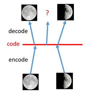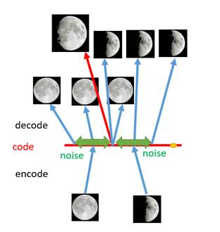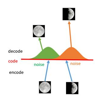 我们先来分析一下现有模型无法达到这一标准的原因。 假设有两张训练图片,一张是全月图,一张是半月图,经过训练我们的自编码器模型已经能无损地还原这两张图片。接下来,我们在 code 空间上,两张图片的编码点中间处取一点,然后将这一点交给解码器,我们希望新的生成图片是一张清晰的图片(类似 3/4 全月的样子)。但是,实际的结果是,生成图片是模糊且无法辨认的乱码图。一个比较合理的解释是,因为编码和解码的过程使用了深度神经网络,这是一个非线性的变换过程,所以在 code 空间上点与点之间的迁移是非常没有规律的。