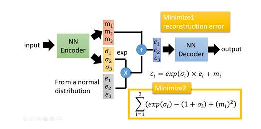 在 auto-encoder 中,编码器是直接产生一个编码的,但是在 VAE 中,为了给编码添加合适的噪音,编码器会输出两个编码,一个是原有编码(m1,m2,m3),另外一个是控制噪音干扰程度的编码(σ1,σ2,σ3),第二个编码其实很好理解,就是为随机噪音码(e1,e2,e3)分配权重,然后加上 exp(σi)的目的是为了保证这个分配的权重是个正值,最后将原编码与噪音编码相加,就得到了 VAE 在 code 层的输出结果(c1,c2,c3)。其它网络架构都与 Deep Auto-encoder 无异。